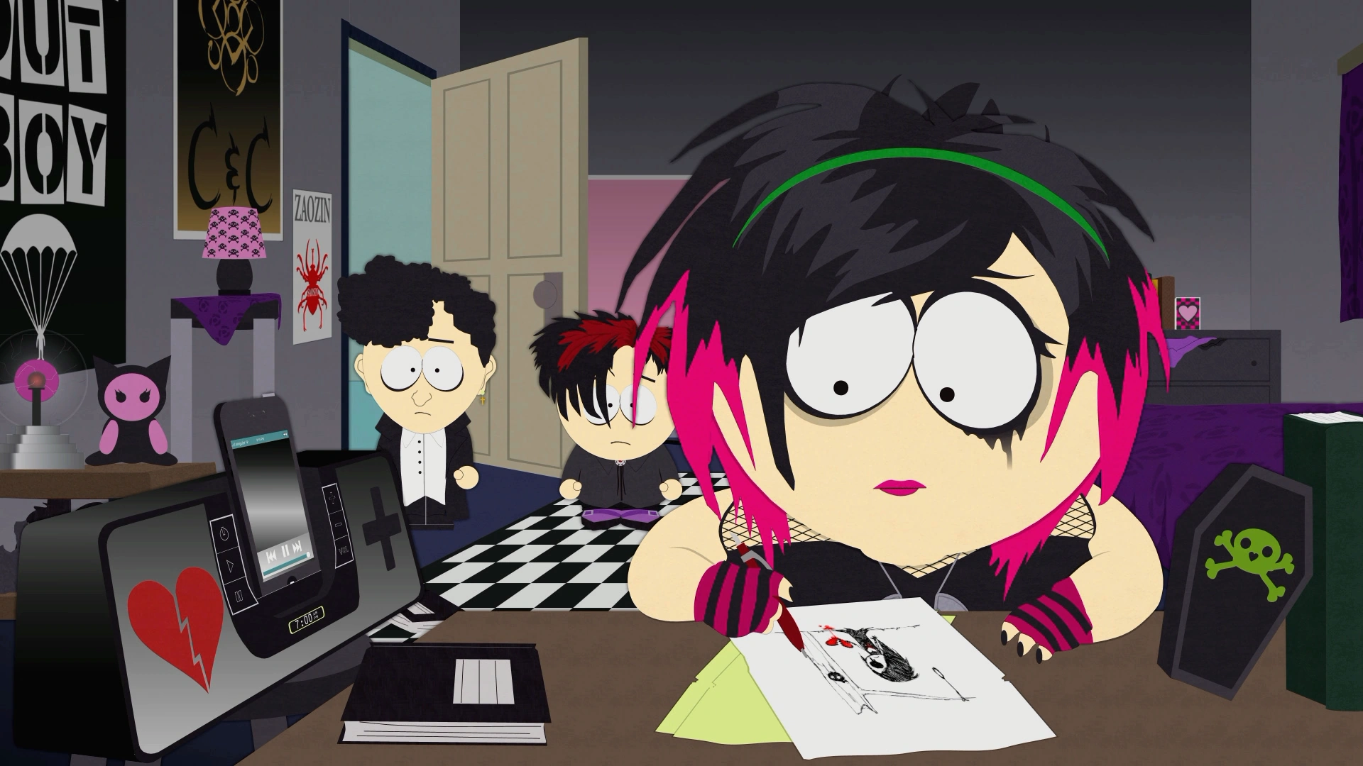 迈克尔意识到亨利埃塔从问题儿童康复营回来后变成了Emo。为了证明这一点,他让她分辨iPod上播放歌曲的种类。