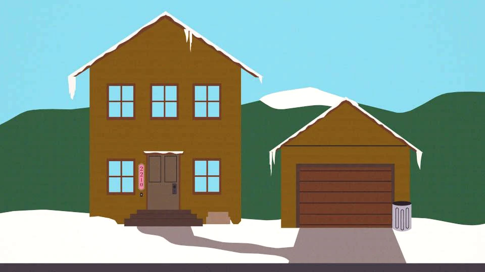 房子的外墙是棕色的。它的后院有栅栏,车库门和前门也都是棕色的。这栋房子的建筑结构和南方公园的其他房子差不多。