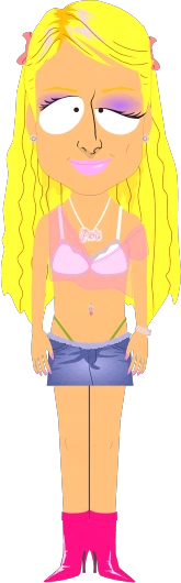 就像真实的帕丽斯·希尔顿一样,她面色很差,病态的过瘦,有着一个罗马人一样的大鼻子,过度美黑的皮肤,一头漂出来的金发。她的紫色眼影的眼睛是不均匀的,一个比另一个眼睑更重,这可能是自然的,也可能是醉酒的结果。她的嘴唇又大又粉。她还戴着一条刻有她名字的项链。她有长长的粉色指甲和蓝色耳钉。她穿着一件透明的粉红色露脐短上衣,里面是白色胸罩(或比基尼)。她还穿了一条蓝色牛仔短裙和一条绿色丁字裤。她脚上穿了一双紫红色的齐踝高统靴。她可能会不断地吐出一团团精液。她是南方公园典型的婊子形象:衣着暴露,渴望与男性发生性关系。