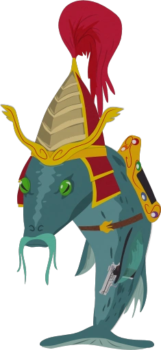 康塔塔鱼是一个戴着日本武士头盔和肩部垫甲的死灵法师。他带着一把带刀鞘的武士刀,一只手拿着三叉戟,另一只手里拿着手枪。他是一只上了年纪的鲶鱼,这可以从他长长的腮须和他将自己的侧鳍当作手来用可以推断出来。
