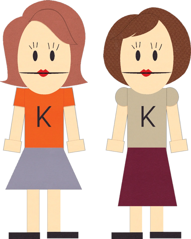 这两个姐妹都有着标准的加拿大式的头、豆豆眼和方块脸。凯瑟琳有淡棕色的头发,抹着红色口红。她还穿了一件中间有一个黑色的“K”的橙色短袖,还有一条浅蓝色的裙子。凯蒂有一头棕色头发,穿着一件浅棕色短袖,上面也有一个黑色的“K”,还穿一条深灰色的裙子。